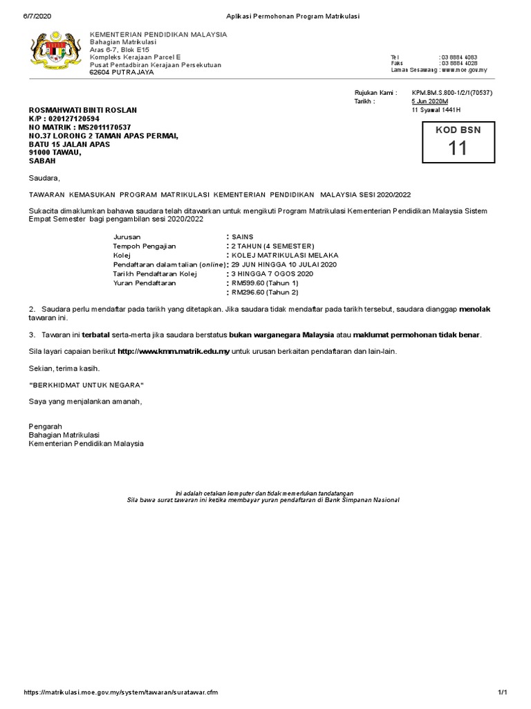 Semakan Keputusan Masuk Program Matrikulasi. Merujuk kepada perkara di atas dengan segala hormatnya dimaklumkan saya nama pemohon no. Surat Tawaran Matrikulasi 2017 from semakanmy Tawaran dengan sendirinya akan terbatal sekiranya anda tidak menepati syarat am universiti dan juga syarat khas program serta membuat pemalsuan data semasa mengisi borang permohonan.